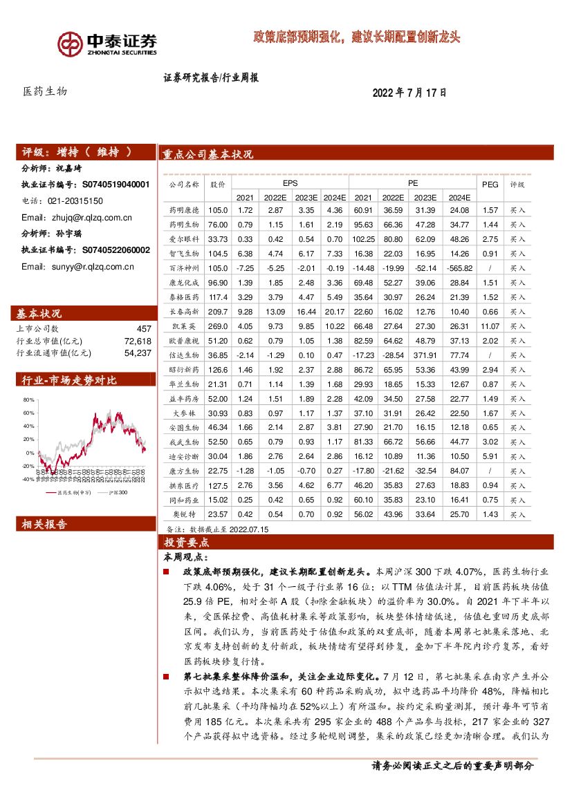 中泰证券:医药生物行业周报:政策底部预期强化,建议长期配置创新龙头.pdf