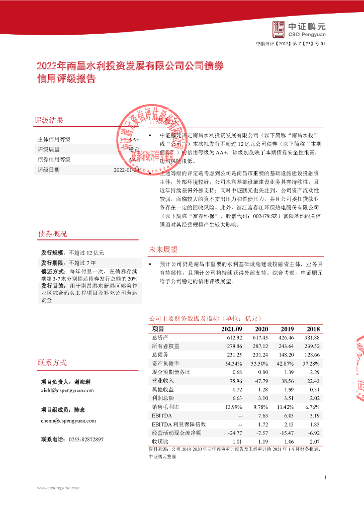 鹏元:2022年南昌水利投资发展有限公司公司债券信用评级报告.pdf