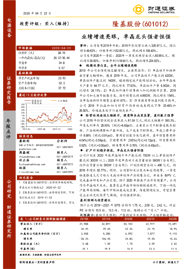 财通证券:隆基股份(601012)-业绩增速亮眼,单晶龙头强者恒强.pdf