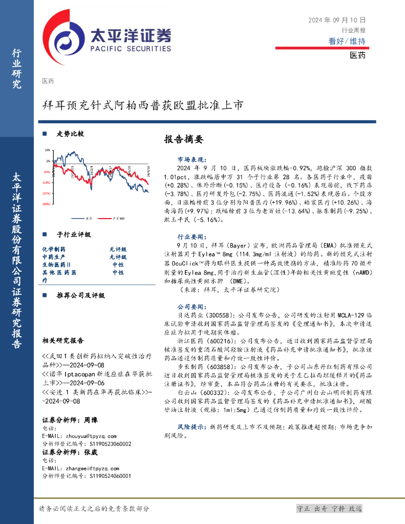 太平洋证券:医药行业周报:拜耳预充针式阿柏西普获欧盟批准上市.pdf