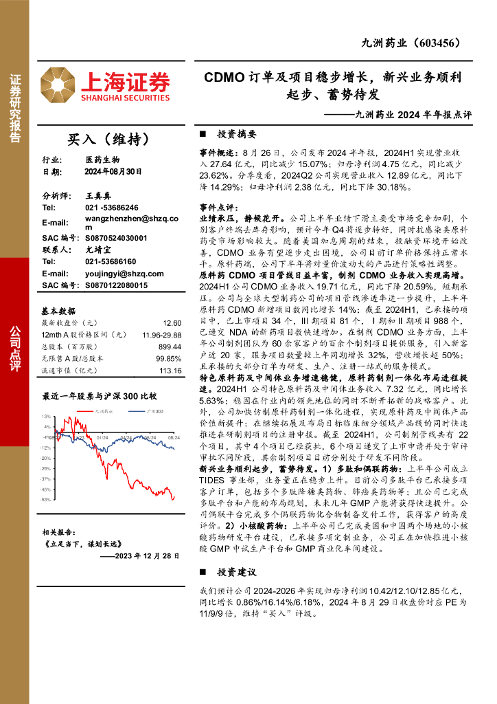 上海证券:九洲药业2024半年报点评:CDMO订单及项目稳步增长,新兴业务顺利起步、蓄势待发.pdf
