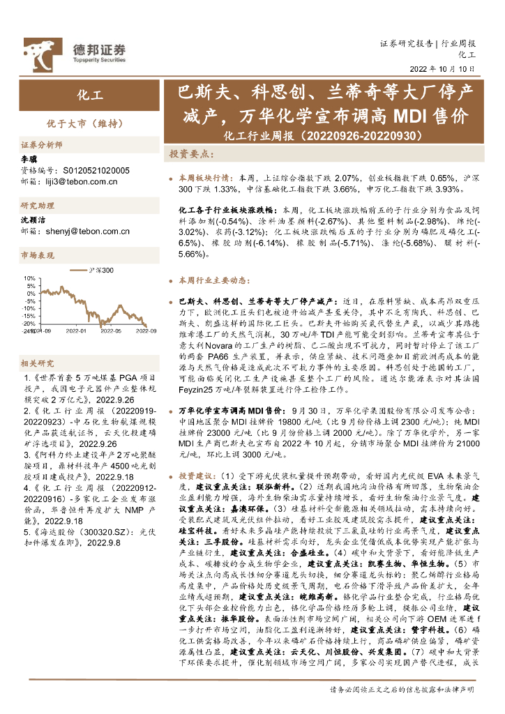 德邦证券:化工行业周报:巴斯夫、科思创、兰蒂奇等大厂停产减产,万华化学宣布调高MDI售价.pdf