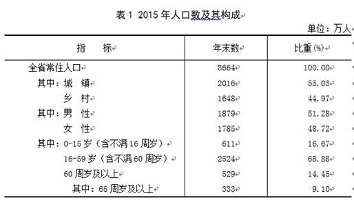 据2015年人口抽样调查,年末全省常住人口3664万人,比上年末增加16万人。全年全省出生人口36万人,人口出生率9.98‰;死亡人口20万人,死亡率5.56‰;自然增长率4.42‰。