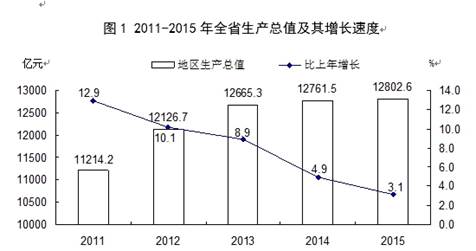 初步核算,全年全省生产总值12802.6亿元,按可比价格计算,比上年增长3.1%。其中,第一产业增加值788.1亿元,增长1.0%,占生产总值的比重6.2%;第二产业增加值5224.3亿元,下降1.1%,占生产总值的比重40.8%;第三产业增加值6790.2亿元,增长9.8%,占生产总值的比重53.0%。