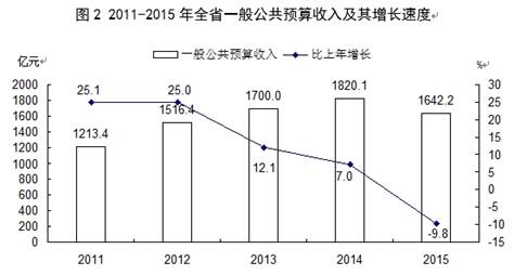 全年全省一般公共预算收入1642.2亿元,下降9.8%。税收收入1056.5亿元,下降6.8%,其中,国内增值税、营业税、企业所得税、个人所得税、资源税和城市维护建设税共计完成税收879.7亿元,下降4.8%。一般公共预算支出3443.4亿元,增长11.2%。其中,教育、医疗卫生、社会保障和就业、住房保障、公共交通运输、节能环保、城乡社区事务等民生支出2900亿元,增长12.3%,民生支出占全省一般公共预算支出的比重84.2%。