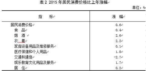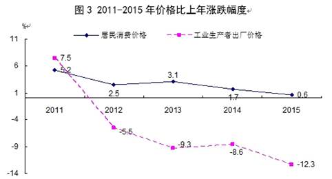 全年全省居民消费价格比上年上涨0.6%,其中,食品价格上涨0.4%。商品零售价格下降0.7%。固定资产投资价格下降1.8%。工业生产者出厂价格下降12.3%,其中生产资料价格下降12.8%,生活资料价格下降0.7%。工业生产者购进价格下降6.9%。农业生产资料价格下降0.4%。