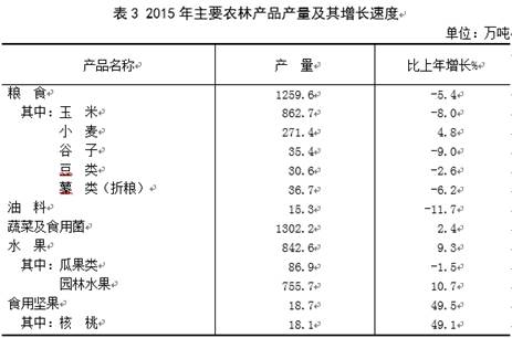 全年粮食产量1259.6万吨,减少71.2万吨,减产5.4%。其中,夏粮272.8万吨,增产4.8%;秋粮986.8万吨,减产7.8%。