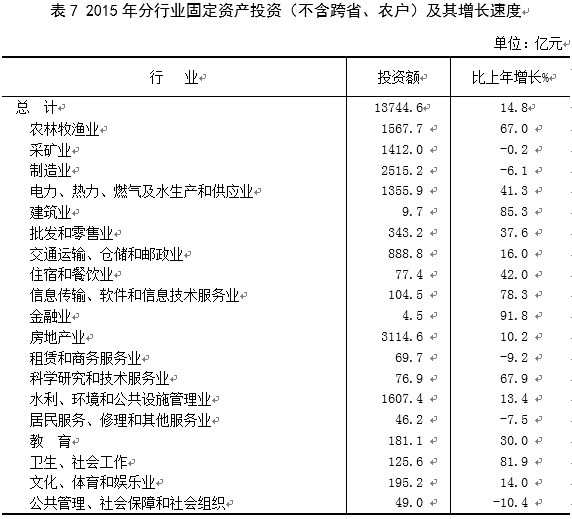 分产业看,第一产业投资1500.0亿元,增长69.1%;第二产业投资5205.0亿元,增长4.0%;第三产业投资7039.5亿元,增长15.7%。