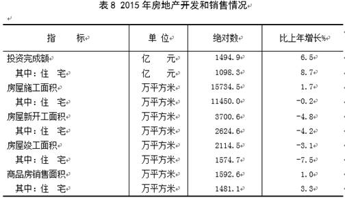 全年房地产开发投资1494.9亿元,增长6.5%。其中,住宅投资1098.3亿元,增长8.7%;商业营业用房投资171.2亿元,下降10.5%。