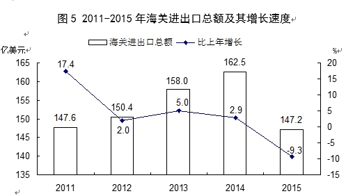 全年全省海关进出口总额147.2亿美元,下降9.3%。其中,进口额62.9亿美元,下降13.7%;出口额84.2亿美元,下降5.8%。