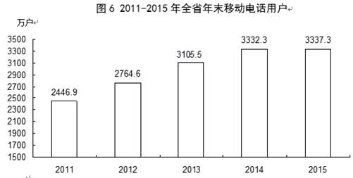 全年全省完成邮电业务总量511.3亿元,增长18.6%。其中,邮政业务总量43.1亿元,增长18.0%;电信业务总量468.2亿元,增长18.7%。年末移动电话用户3337.3万户,其中,3G移动电话用户721.4万户,4G移动电话用户1198.2万户。全省宽带接入用户606.1万户,增长6.1%。