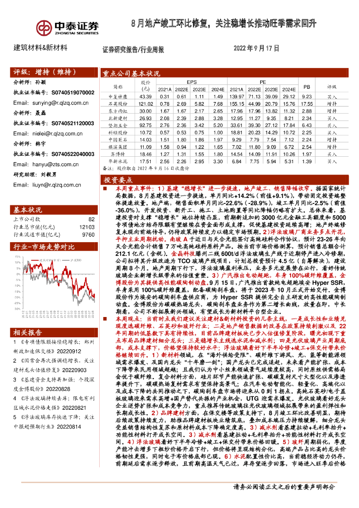 中泰证券:建筑材料&新材料行业周报:8月地产竣工环比修复,关注稳增长推动旺季需求回升.pdf
