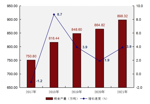 全年粮食产量179.66亿斤,比上年增加6.7亿斤,增长3.9%。粮食作物平均单产965.66斤/亩,较上年增加31.88斤/亩,增长3.4%。
