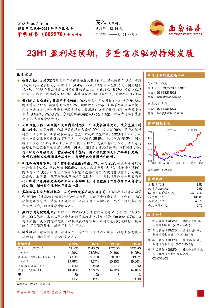 西南证券:华明装备(002270)-23H1盈利超预期,多重需求驱动持续发展.pdf
