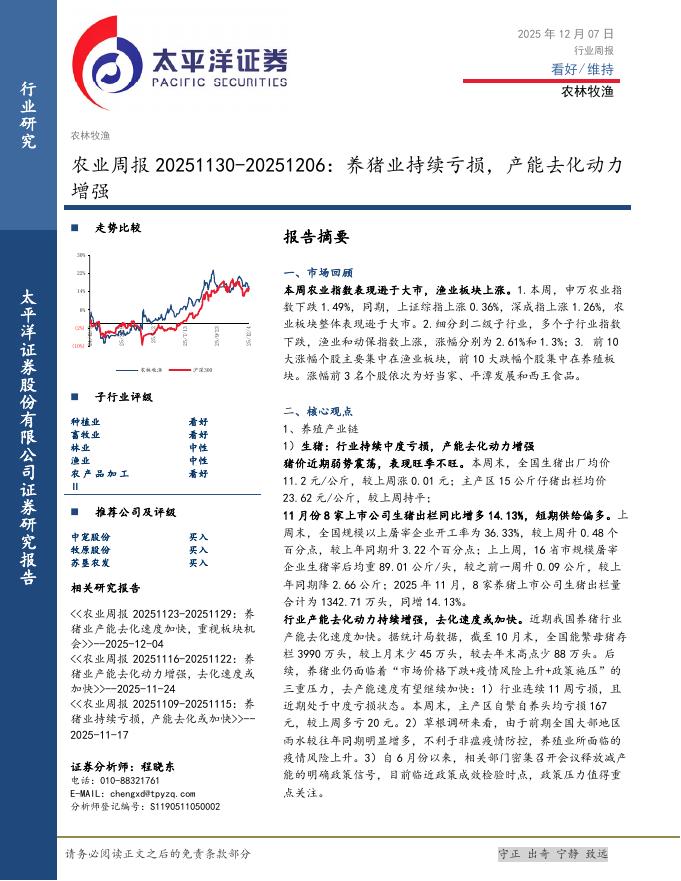 太平洋证券:农林牧渔行业农业周报:养猪业持续亏损,产能去化动力增强.pdf