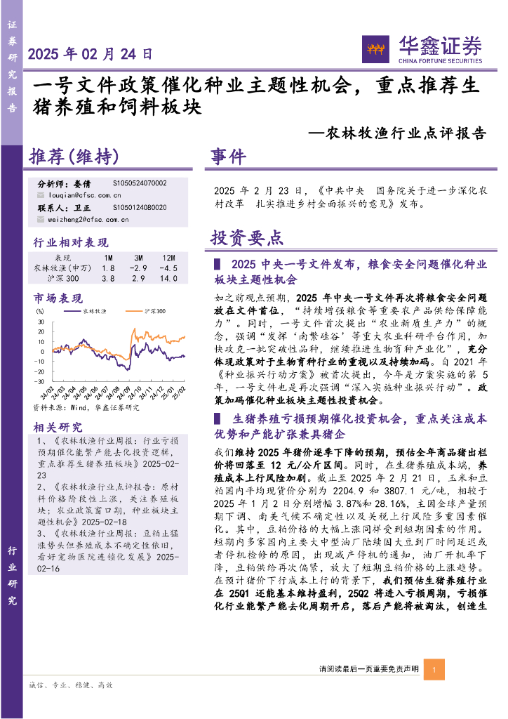 华鑫证券:农林牧渔行业点评报告:一号文件政策催化种业主题性机会,重点推荐生猪养殖和饲料板块.pdf