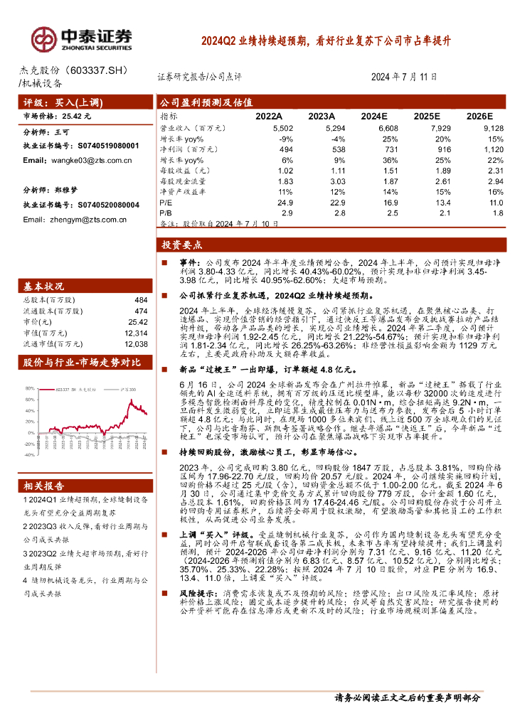 中泰证券:杰克股份(603337)-2024Q2业绩持续超预期,看好行业复苏下公司市占率提升.pdf