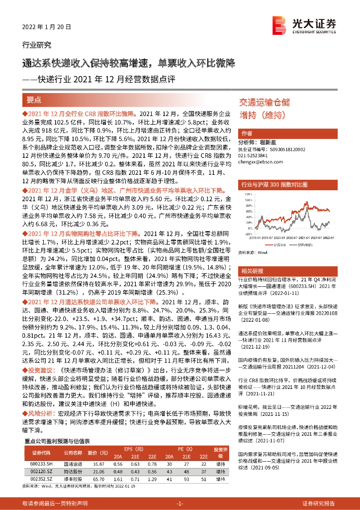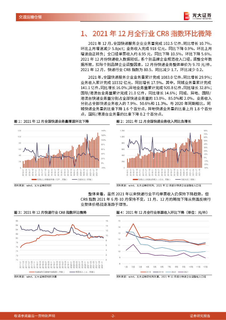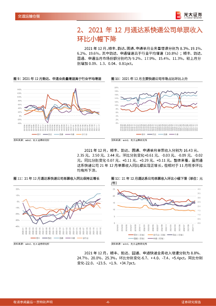 光大证券:快递行业2021年12月经营数据点评:通达系快递收入保持较高增速,单票收入环比微降.pdf