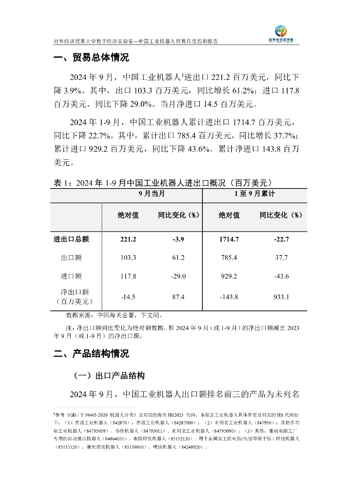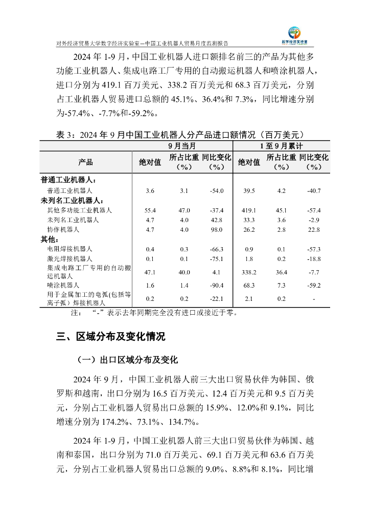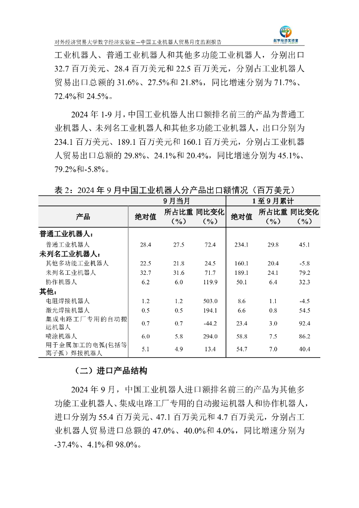 对外经济贸易大学:中国工业机器人贸易月度监测报告(2024年1-9月).pdf