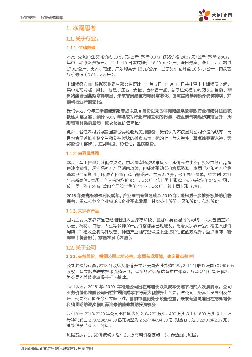天风证券:农林牧渔2018第45周周报:非洲猪瘟继续蔓延,继续推荐养猪板块,禽链景气冲高,首推圣农发展!.pdf