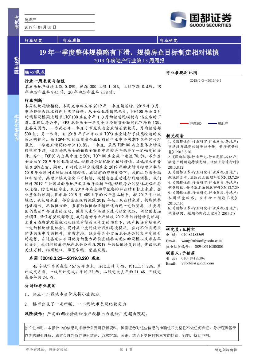 国都证券:2019年房地产行业第13周周报:19年一季度整体规模略有下滑,规模房企目标制定相对谨慎.pdf