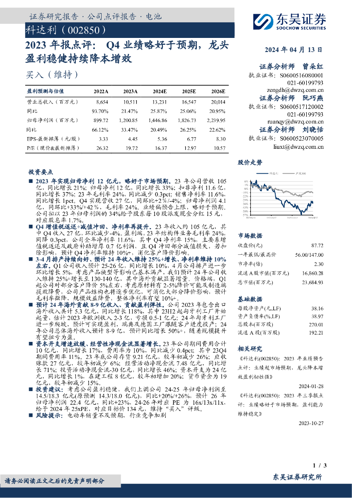 东吴证券:科达利(002850)-2023年报点评:Q4业绩略好于预期,龙头盈利稳健持续降本增效.pdf