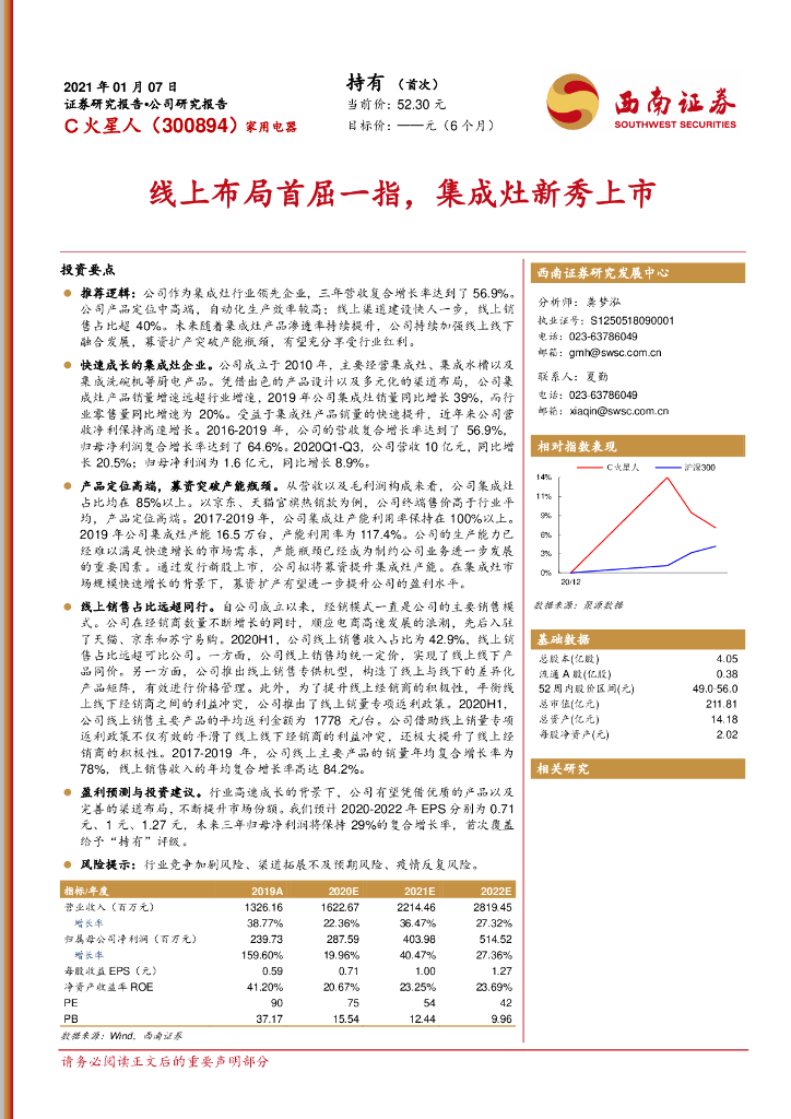 西南证券:火星人(300894)-线上布局首屈一指,集成灶新秀上市.pdf