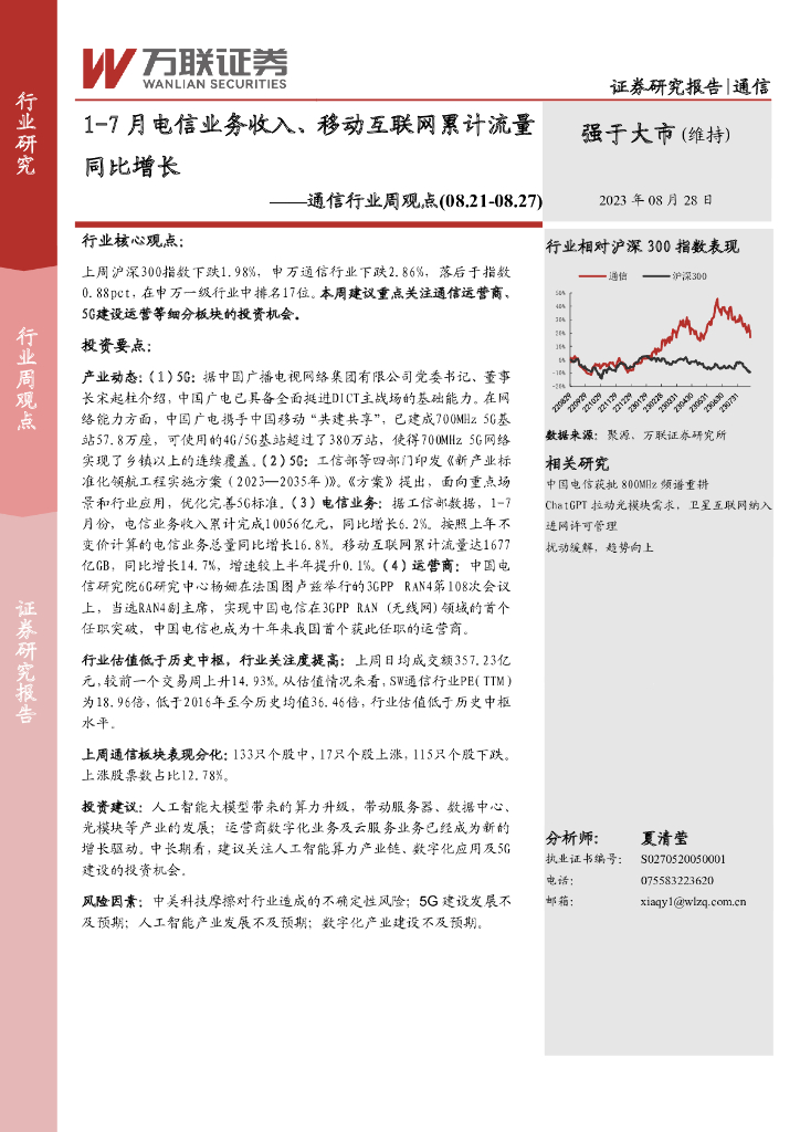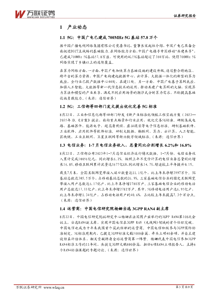 万联证券:通信行业周观点:1-7月电信业务收入、移动互联网累计流量同比增长.pdf