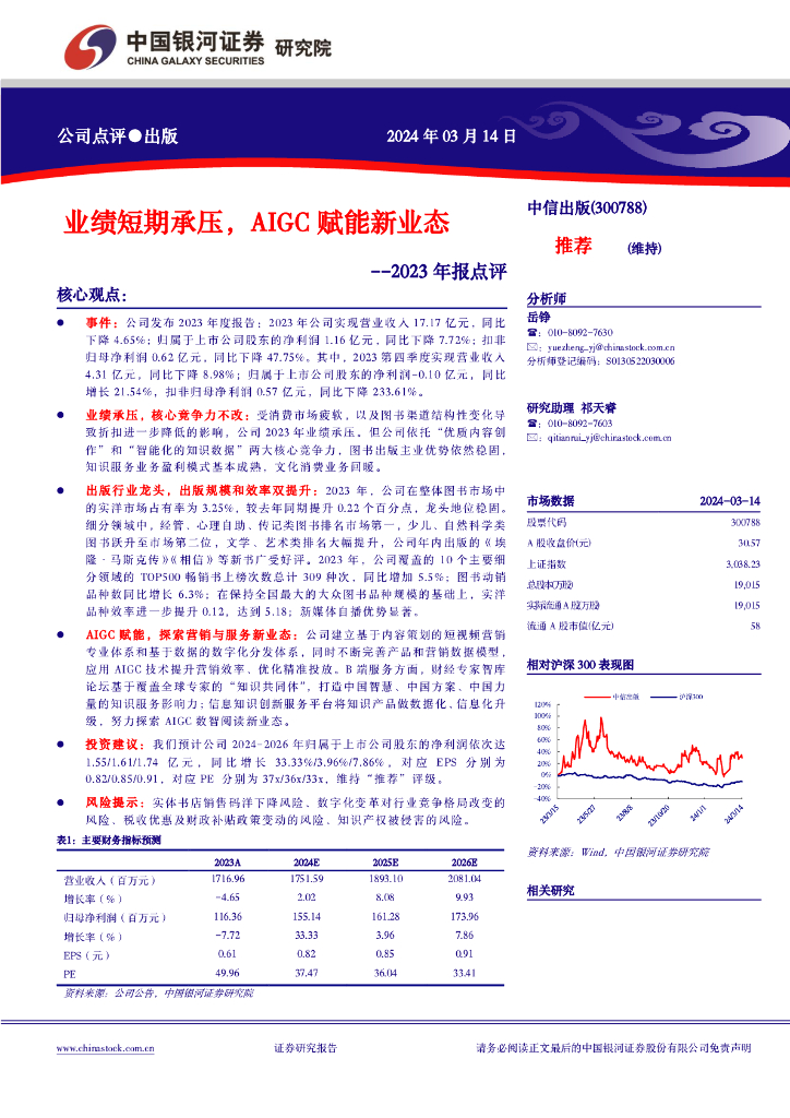中国银河:中信出版(300788)-业绩短期承压,AIGC赋能新业态--2023年报点评.pdf