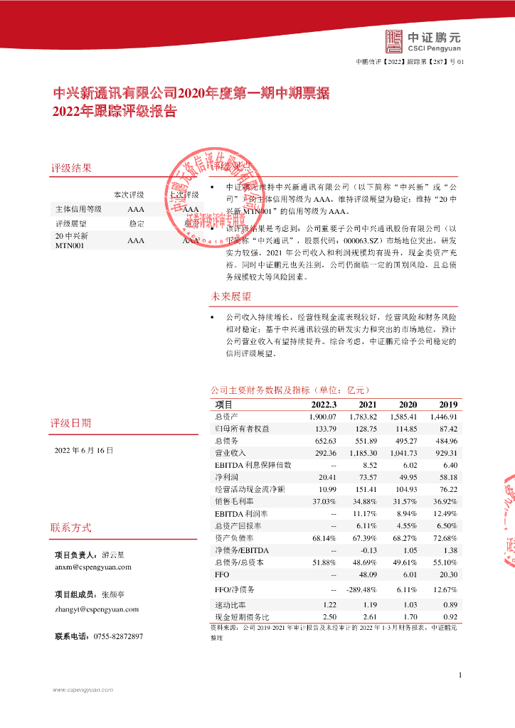 鹏元:中兴新通讯有限公司2020年度第一期中期票据2022年跟踪评级报告.pdf