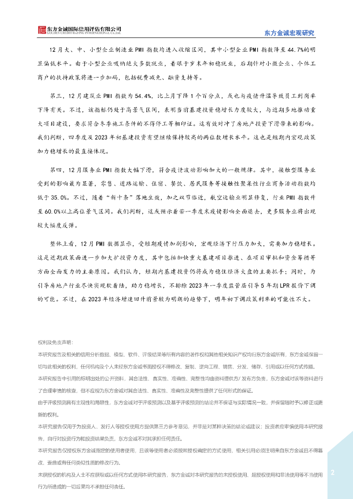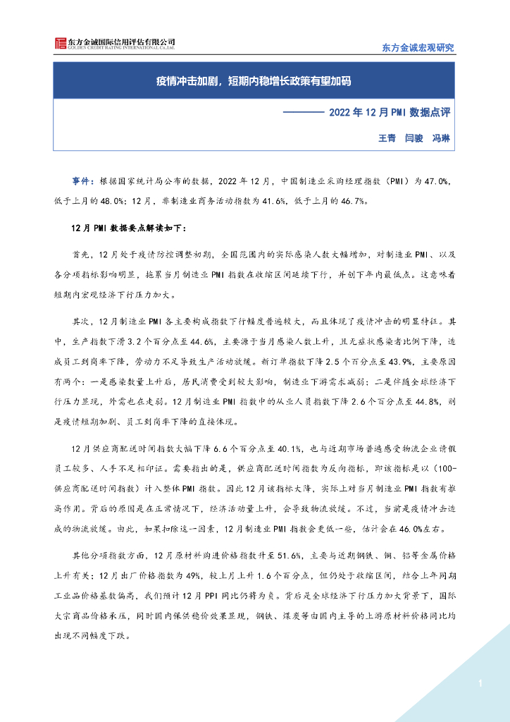 东方金诚:疫情冲击加剧,短期内稳增长政策有望加码(2022年12月PMI数据点评).pdf
