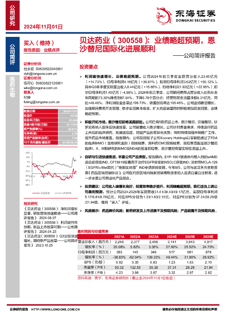 东海证券:贝达药业(300558)-公司简评报告:业绩略超预期,恩沙替尼国际化进展顺利.pdf