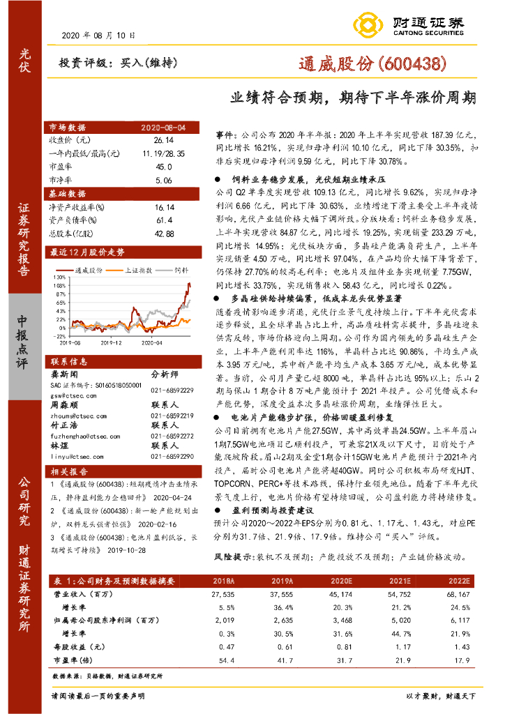 财通证券:通威股份(600438)-业绩符合预期,期待下半年涨价周期.pdf