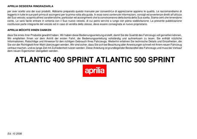 aprilia 8181096 ATLANTIC 400 SPRINT- ATLANTIC 500 SPRINT I-D MY 2006 使用手册.pdf