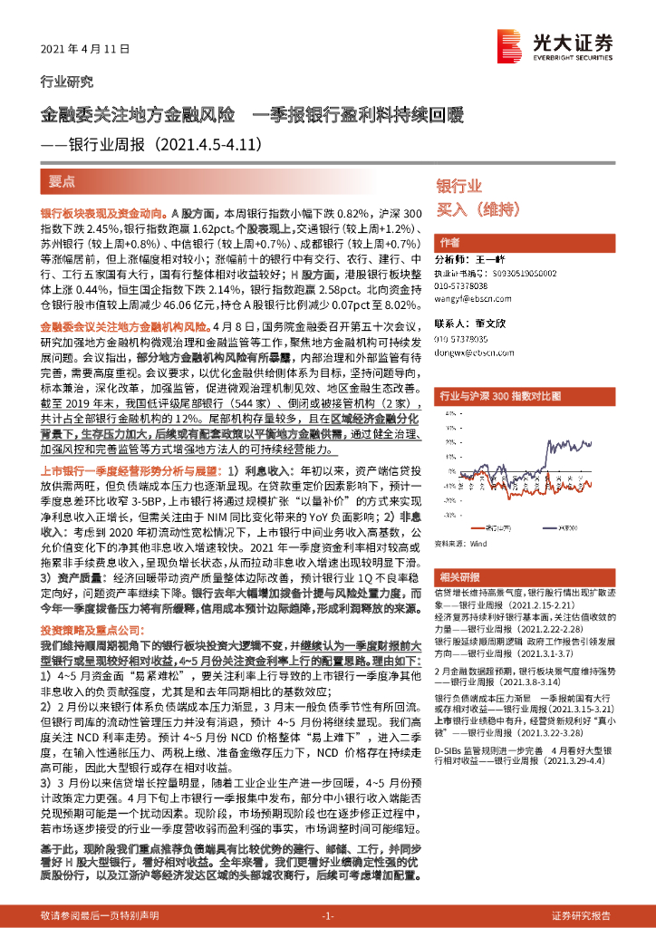 光大证券:银行业周报:金融委关注地方金融风险 一季报银行盈利料持续回暖.pdf