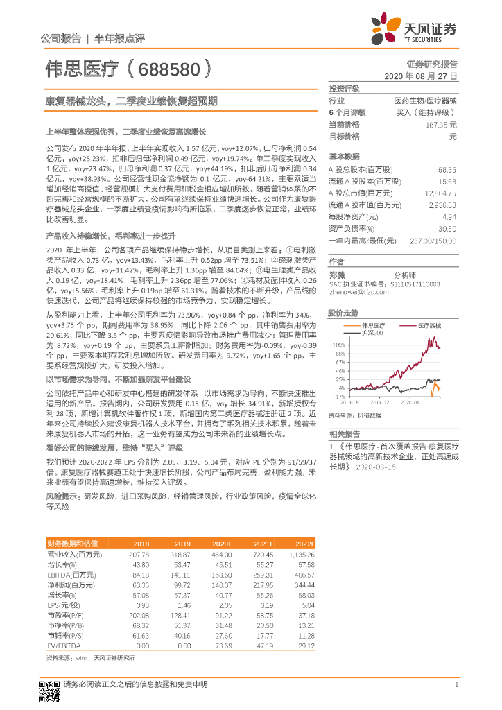 天风证券:伟思医疗(688580)-康复器械龙头,二季度业绩恢复超预期.pdf