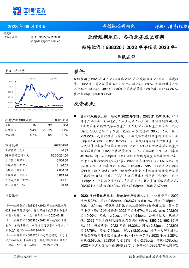 国海证券:经纬恒润(688326)-2022年年报及2023年一季报点评:业绩短期承压,各项业务成长可期.pdf