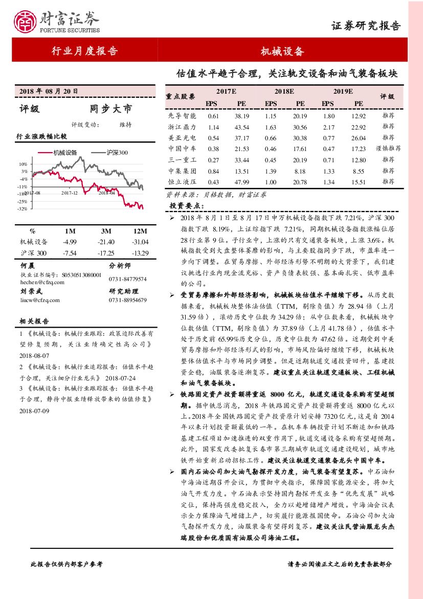 财富证券:机械设备行业月度报告:估值水平趋于合理,关注轨交设备和油气装备板块.pdf