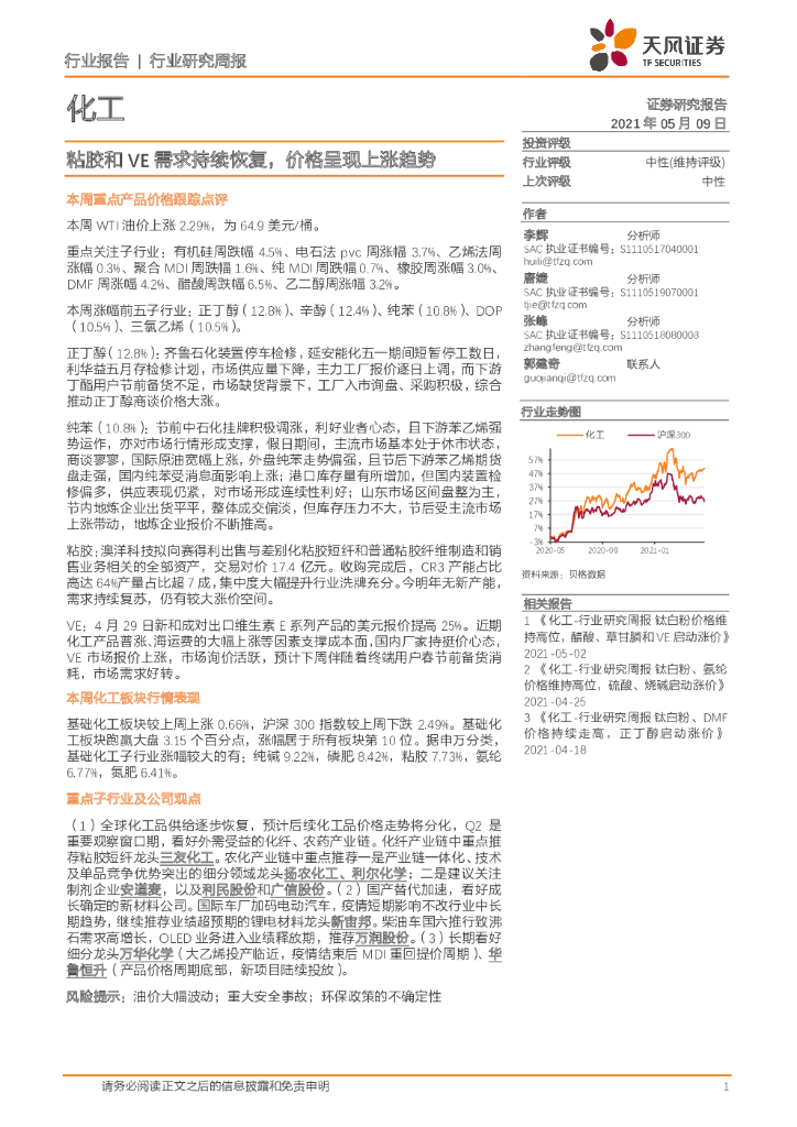 天风证券:化工行业:粘胶和VE需求持续恢复,价格呈现上涨趋势.pdf