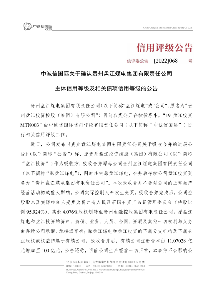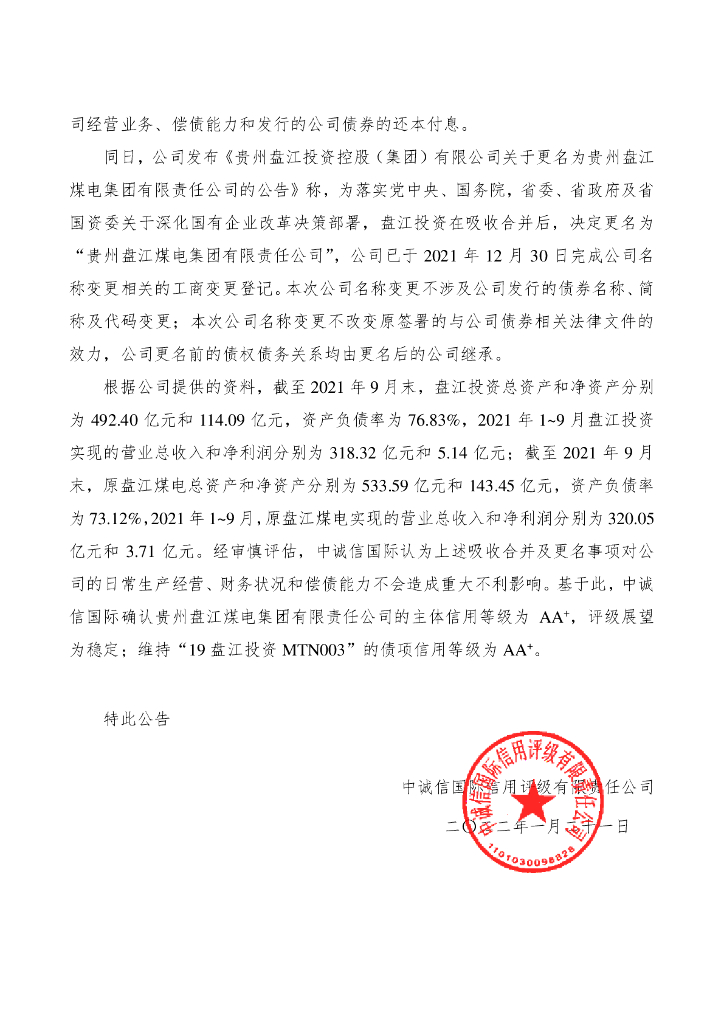 中诚信:中诚信国际关于确认贵州盘江煤电集团有限责任公司主体信用等级及相关债项信用等级的公告.pdf