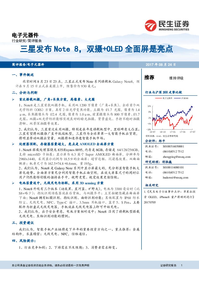 民生证券:电子元器件行业:三星发布Note8,双摄+OLED全面屏是亮点.pdf