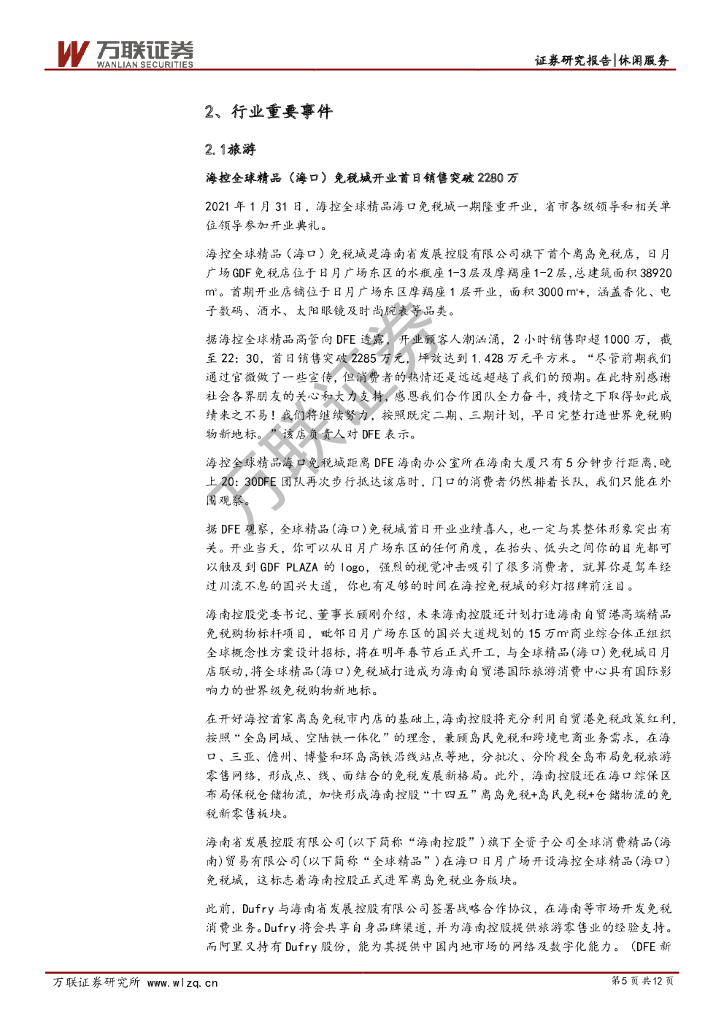 万联证券:休闲服务行业周观点报告:海控精品免税城首日销售超2280万,CDF国际免税城初具雏形.pdf