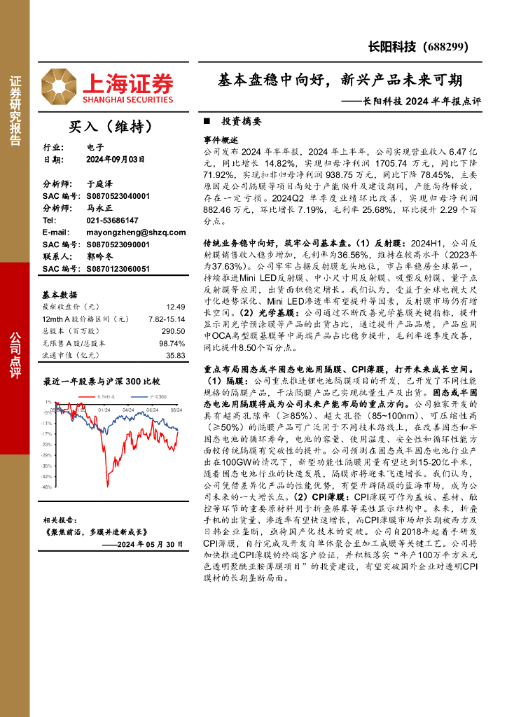上海证券:长阳科技2024半年报点评:基本盘稳中向好,新兴产品未来可期.pdf