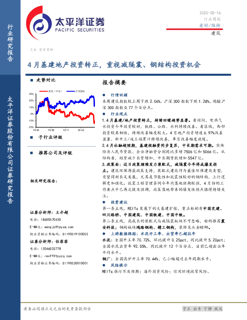 太平洋证券:建筑行业周报:4月基建地产投资转正,重视减隔震、钢结构投资机会.pdf