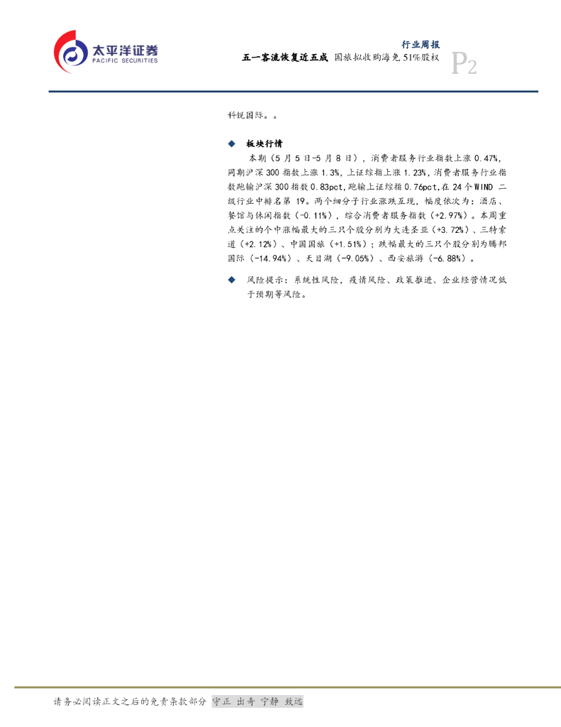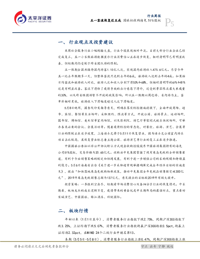 太平洋证券:消费行业周报:五一客流恢复近五成国旅拟收购海免51%股权.pdf