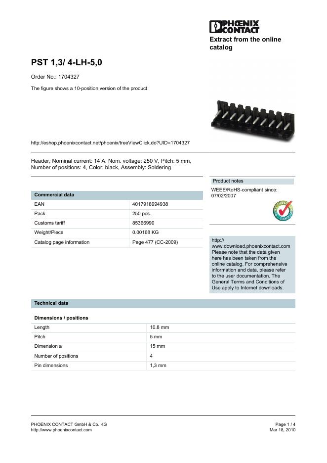 PHOENIX CONTACT PST 1,3/ 4-LH-5,0 Order No.: 1704327 The figure shows a 10-position version of the product 数据手册.pdf
