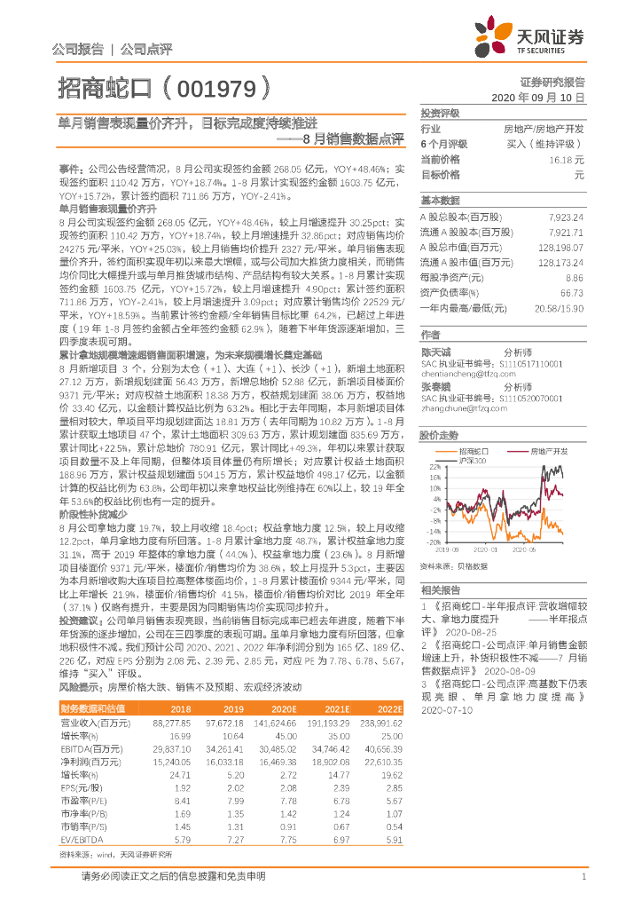 天风证券:招商蛇口(001979)-8月销售数据点评:单月销售表现量价齐升,目标完成度持续推进.pdf