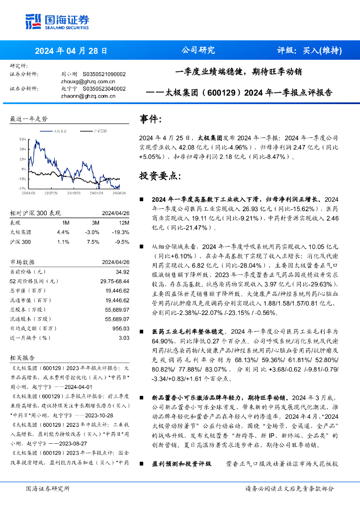 国海证券:太极集团(600129)-2024年一季报点评报告:一季度业绩端稳健,期待旺季动销.pdf