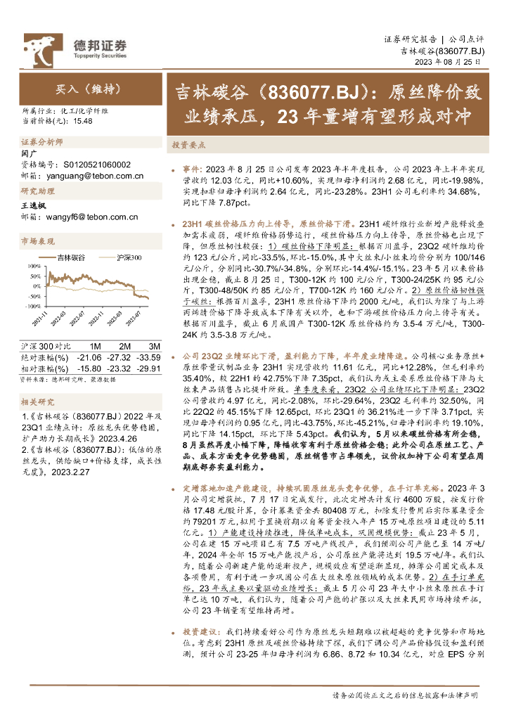 德邦证券:吉林碳谷(836077)-原丝降价致业绩承压,23年量增有望形成对冲.pdf