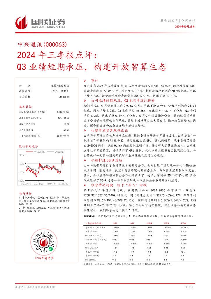国联证券:中兴通讯(000063)-2024年三季报点评:Q3业绩短期承压,构建开放智算生态.pdf